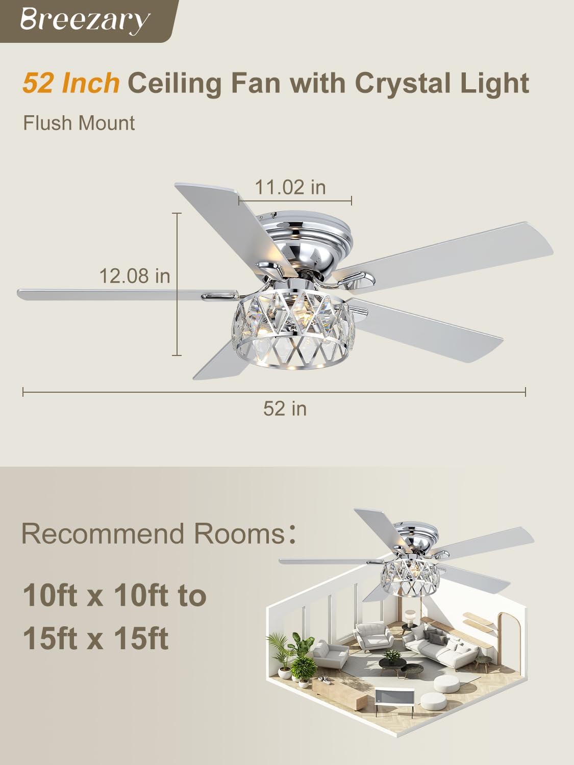 52-Inch 5-Blade Flush Mount Ceiling Fans with Lights Remote Control, 5 Plywood Blades, Reversible DC Motor, 6-Speed Low Profile Ceiling Fan for Bedroom Living Room Kitchen Product Features: Fan Type: Flush Mount Ceiling Fan Light Style: Industrial/Modern/Farmhouse Material: Metal, Plywood, Acrylic Body Color: Chrome Number of Blades: 5 Blade Size: 20.5" L x 5.5"W Material of Blades: Plywood Blade Colors: Silver Blade Pitch: 13 Degree Lighting: Light Bulbs(Not Included) Dimmable: No Motor Type: DC Motor Reversible Motor: Yes Motor Voltage: 110V-120V/60Hz Motor Watts: 30W Speed: 6-Speed Max Motor Speeds: 130 RPM Max CFM: 4800 Sloped Ceiling Compatible: No Low Noise: Yes Airflow Efficiency: 216 Product Dimensions and Weights: Overall Size: 52 inches diameter x 12.1 inches height Net Weight: 13.14 lb Package Includes: 1 x 52 inch 5-Blade Ceiling Fan Light, 1 x Remote Control, 1 x User Manual