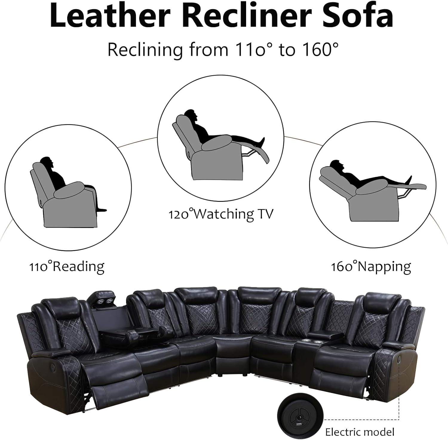 Power Reclining Sectional Sofa Set with LED Lights & Wireless Ports,Faux Leather Corner Couch for Home Theater & Living Room, 330LBS/Seat, Cup Holders & Storage Console (Black)