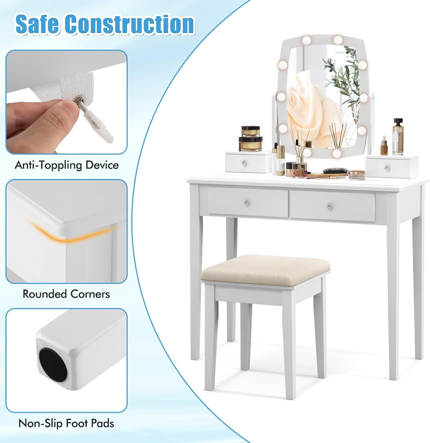 Description: Make your daily makeup routine easier with this vanity table with lighted mirror and stool! This vanity table set includes a vanity desk with LED lighted mirror and a soft cushioned stool. The lights feature 3 color modes (3000K warm yellow, 4000K warm white, 6500K cool white) and adjustable brightness, which allows you to choose the desired lighting according to your makeup needs. There are 4 drawers for your cosmetics, skincare products, jewelry and more. Besides, the detachable top allows you to use this makeup desk as a study table or console table. Crafted with well-made details, this vanity table set offers long-lasting service. Features: Equipped with LED lights with 3 color modes and adjustable brightness Easy to control with the touch switch Provides roomy storage space with 2 small drawers and 2 large drawers Convenient for making up with 360° rotatable mirror Comes with a comfortable cushioned stool Constructed in a sturdy and durable structure Adds extra safety with the anti-toppling device Crafted with rounded corners and non-slip foot pads Hassle free to assemble with detailed instructions Specifications: Color: White Material: MDF, Pine Wood, Rubber Wood Table Dimension: 36"x 16"x 52" (L x W x H) Stool Dimension: 14"x 10.5"x 17" (L x W x H) Weight Capacity of Tabletop: 110 lbs Weight Capacity of Stool: 200 lbs Net Weight: 37.5 lbs Package includes: 1 x Vanity Table 1 x Vanity Stool 1 x User Guide