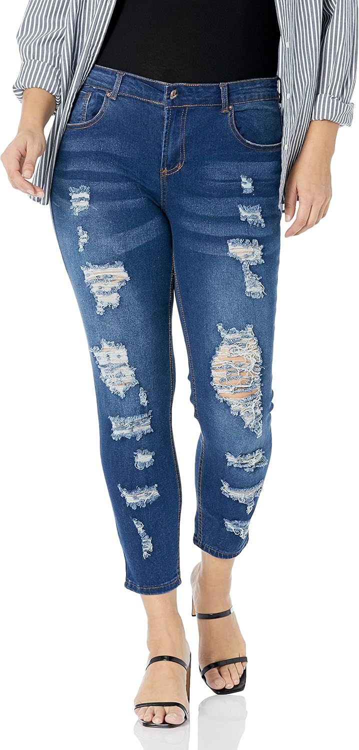 Women's Junior Plus 5 pocket Fashion medium Skinny Jeans with heavy front and back destruction