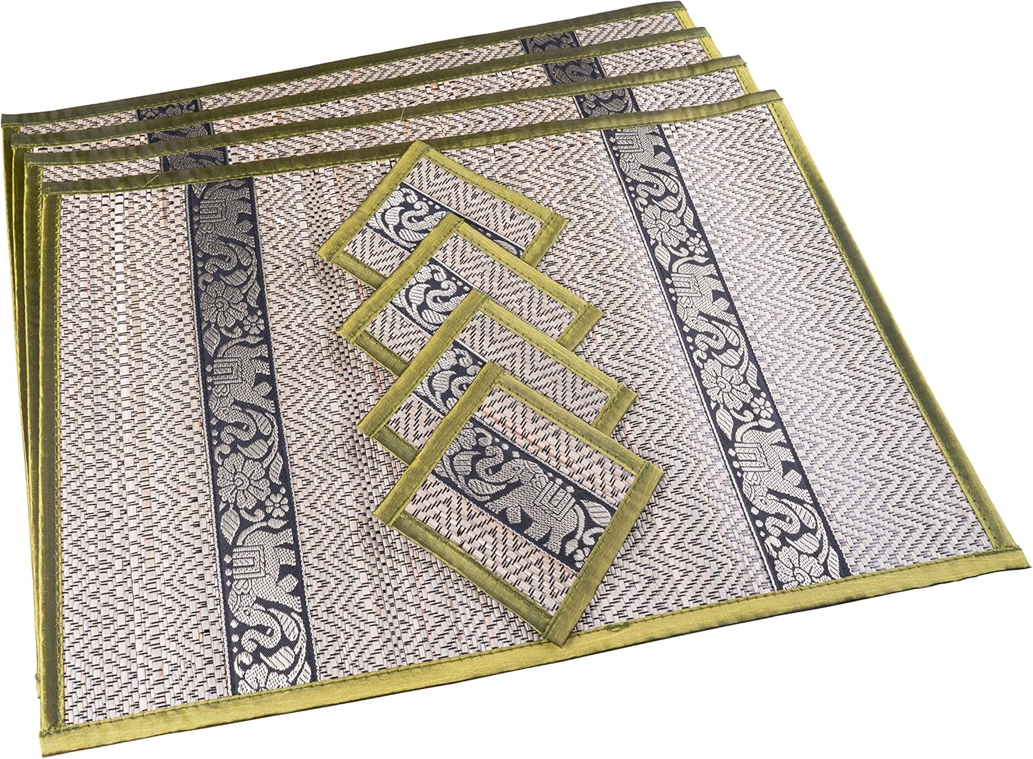 Experience the charm of our hand-woven wicker reed placemats and coaster set, crafted by skilled artisans using sustainable materials. These eco-friendly alternatives to plastic are heat resistant and easy to clean, ensuring your table stays protected and pristine. With a Thai-style design and decorative lace elephant trim, they add an elegant touch to any dining occasion. Available in medium and large sizes, each set includes matching coasters. Embrace ethical craftsmanship and enhance your interior decor with these durable and visually stunning placemats. Upgrade your dining experience and make a statement while reducing your environmental footprint. Medium placemats measure approximately 35cm by 25cm (14 x 10 inches), Large sizes which has same trim as medium but they measure 45cm long and 30cm wide (18 x 12 inches) Finally Luxury Large which a wider side trim Placemat measures approximately 45cm long and 30cm wide (18 x 12 inches). Each set includes four placemats and four coasters, coasters measuring 10cm by 10cm (4 x 4 inches).