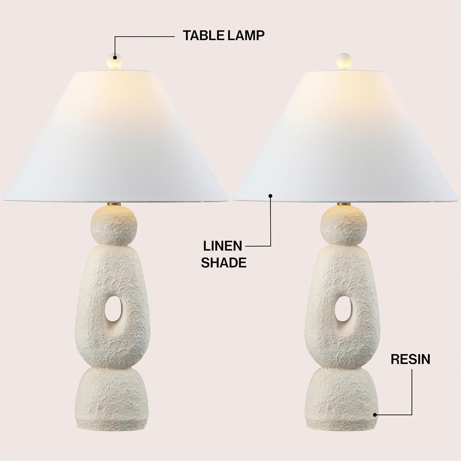 This sculptural set of two table lamps adds artistic form and soft illumination to any space. The resin body features a smooth matte texture and organic cutout design accented with brass-toned details for a touch of elegance. Perfect for balancing statement and simplicity, they bring refined charm to living rooms or bedside settings.