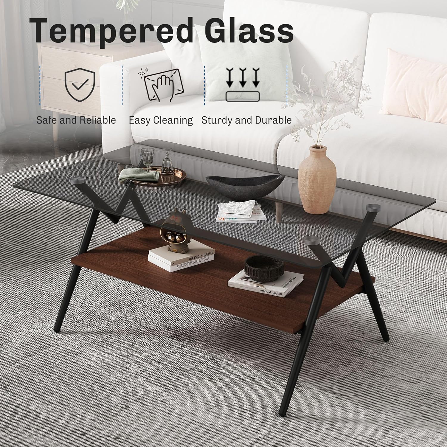 "Indulge in the perfect fusion of elegance and functionality with our ""Golden Elegance"" Modern Rectangle Coffee Table. Designed to elevate your living space, this coffee table boasts a sleek and contemporary design that effortlessly blends into any decor style.Crafted with meticulous attention to detail, the upper panel features a stunning tempered glass top, adding a touch of sophistication to your home. Whether you're enjoying a quiet morning coffee or entertaining guests, this table exudes an air of refinement.Beneath the exquisite glass surface lies a sturdy foundation constructed from high-quality MDF material, ensuring stability and durability for years to come. Supported by golden metal legs, this table offers robust support, capable of withstanding heavy loads with ease.Safety is paramount, which is why we've meticulously polished the edges of the glass top to perfection, enhancing both safety and aesthetic appeal. Say goodbye to sharp edges and hello to peace of mind.Not just a visual delight, this coffee table is also highly practical. Its tempered glass surface is a breeze to clean and maintain, making it ideal for everyday use. Plus, the combination of glass and MDF materials creates a beautiful contrast, adding versatility to complement various interior styles.Experience the epitome of luxury and functionality with our ""Golden Elegance"" Modern Rectangle Coffee Table. Easy to assemble with all hardware and accessories provided, it's time to elevate your living space with unparalleled sophistication. "