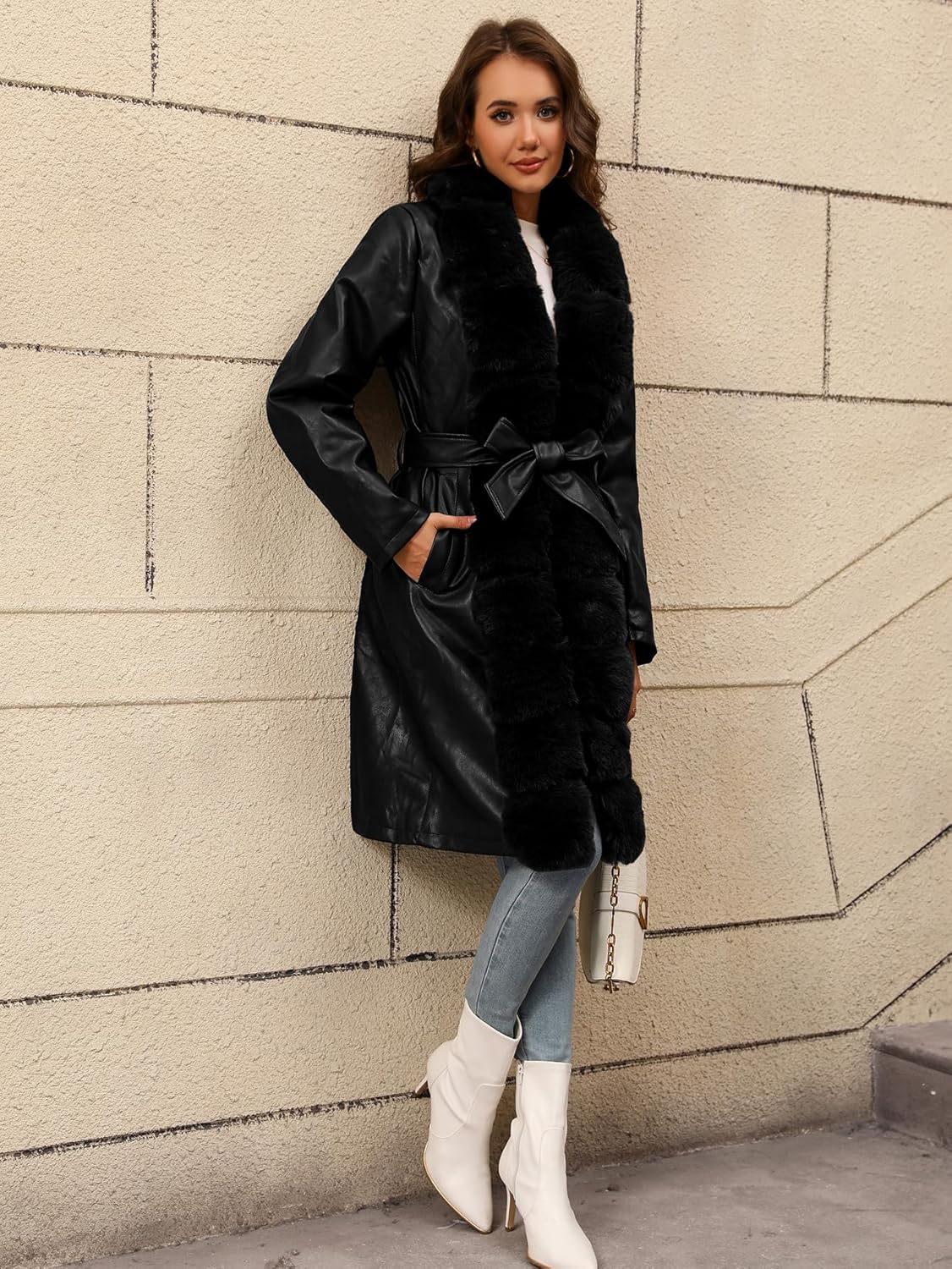 This coat blends sleek, scratch-resistant faux leather with plush faux fur for a chic, cozy look. The adjustable waist tie creates a flattering silhouette. Its statement collar adds insulation and style. The mid-length design pairs well with various outfits for different occasions. Easy care ensures lasting elegance with minimal upkeep