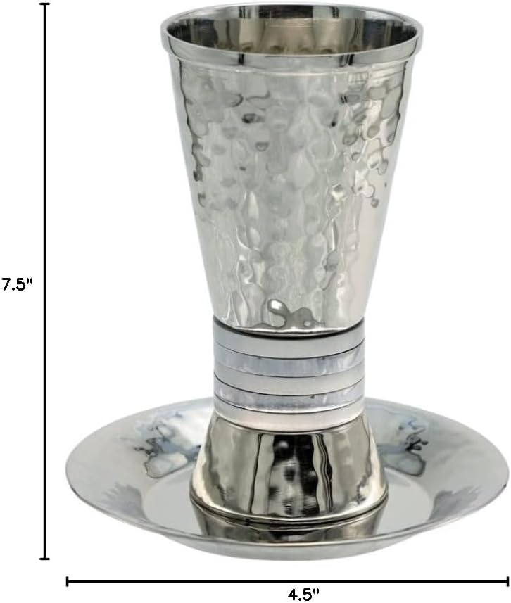 levate your Shabbat and holiday ceremonies with our sophisticated Hammered Nickel Kiddush Cup and Saucer. Standing at 4.5 inches tall, this set features a beautiful hammered nickel finish, accented by elegant silver and gray anodized aluminum rings, adding a touch of modern refinement to its classic design. Crafted from high-quality nickel, this Kiddush cup is built to last, ensuring it remains a cherished part of your Judaica collection for years to come. The matching saucer completes the set, creating a cohesive and stylish presentation that will impress your guests. Perfect for Kiddush ceremonies, this cup and saucer set combines functionality with aesthetic appeal. Its durable construction and elegant design make it a popular choice among Judaica enthusiasts. This Kiddush cup set also makes a thoughtful and meaningful gift for weddings, housewarmings, or any special occasion. Celebrate tradition and elegance with this exquisite Kiddush cup and saucer set.